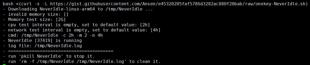 bash <(curl -s -L https://gist.githubusercontent.com/Ansen/e45320205faf5786d3282ac880f20bab/raw/onekey-NeverIdle.sh)