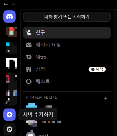 디스코드 좌측 상단에 위치한 "+" 버튼을 눌러 서버를 추가한다.