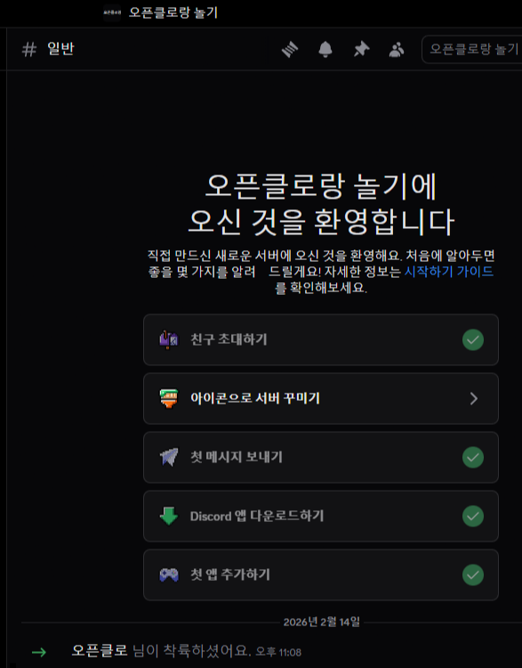 봇이 성공적으로 추가 되면 디스코드 서버에 "착륙" 메시지가 나타난다.