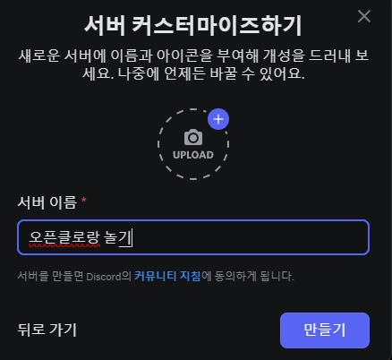 윈도우 기준 디스코드 설치하고 아래와 같은 단계로 우선 서버를 만들어야 한다