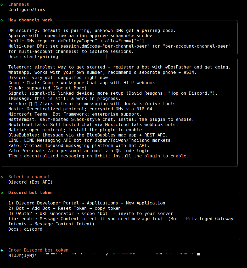이전 포스팅에서 OpenAI 연동하듯이 config 명령어를 이용해서 채널(메신저) 설정을 진행한다.