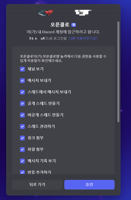 자 그러면 이제 "OAuth2" 메뉴 마지막에 나온 링크를 브라우저에 복사하면 위 사진처럼 나오는데 본인이 생성한 서버에 추가한다.