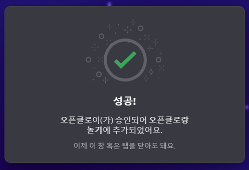 그러면 권한을 다시 한번 확인해서 승인하는 창이 뜨고, 승인까지 하면 성공 창이 뜬다.