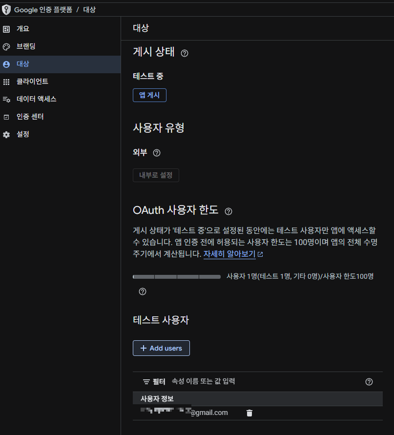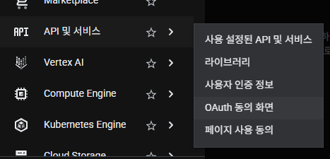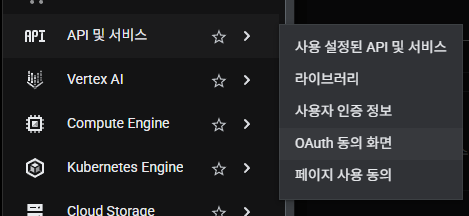 "API 및 서비스"의 "OAuth 동의 화면"으로 들어간다.