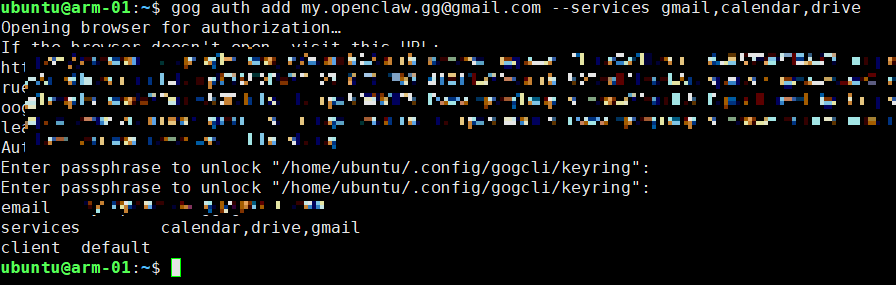 오픈클로 설치 된 환경에서 위 명령어를 실행하면 URL 하나 주는데 연동하고자 하는 구글 계정이 로그인 된 브라우저에서 열어야 한다.