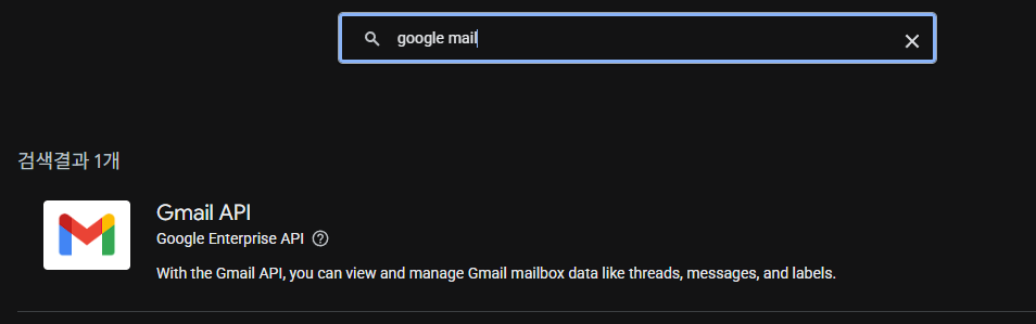 그러면 좌측에서 "API 및 서비스" - "라이브러리"를 눌러서 내가 원하는 서비스(메일, 캘린더 등)에 대해서 활성화를 해야한다.