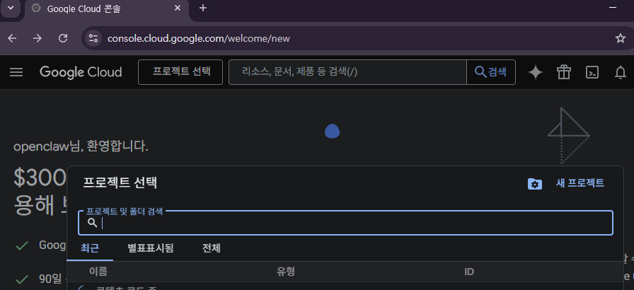 좌측 상단의 "프로젝트 선택" 후 나타나는 창에서 "새 프로젝트" 클릭한다.