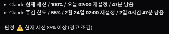 - 현재 세션 또는 주간 한도 중 하나라도 **85% 이상**이면 `주의`